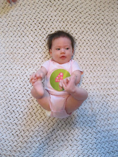 Lane was four months old on 8/19. She is so much fun now and her personality is really coming out. She found her feet, so she usually has piggies or her thumb in her mouth. She belly laughs when we play peekaboo and it cracks us up every time. She is quite the attention hound and growls to get us to pay attention to her. She loves to people watch-especially the big girls (and they love to entertain her). She is scooting all over the place and will probably start crawling any time now.